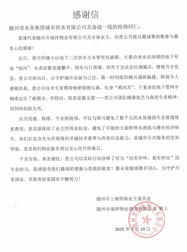 719日,上城明珠小區(qū)業(yè)委會與瑞祥物業(yè)的代表滿懷感激,將一面繡有排憂解難、水域神探的錦旗和一封情真意切的感謝信送到城市供水公司,以此表達全體業(yè)主對城市供水公司的誠摯謝意。若不是有你們團隊的精湛技藝與高度負責精神,我們的損失不堪設(shè)想!這面錦旗雖輕,卻裝著全體業(yè)主的滿心感激!代表們緊握工作人員的手,話語間滿是動容。